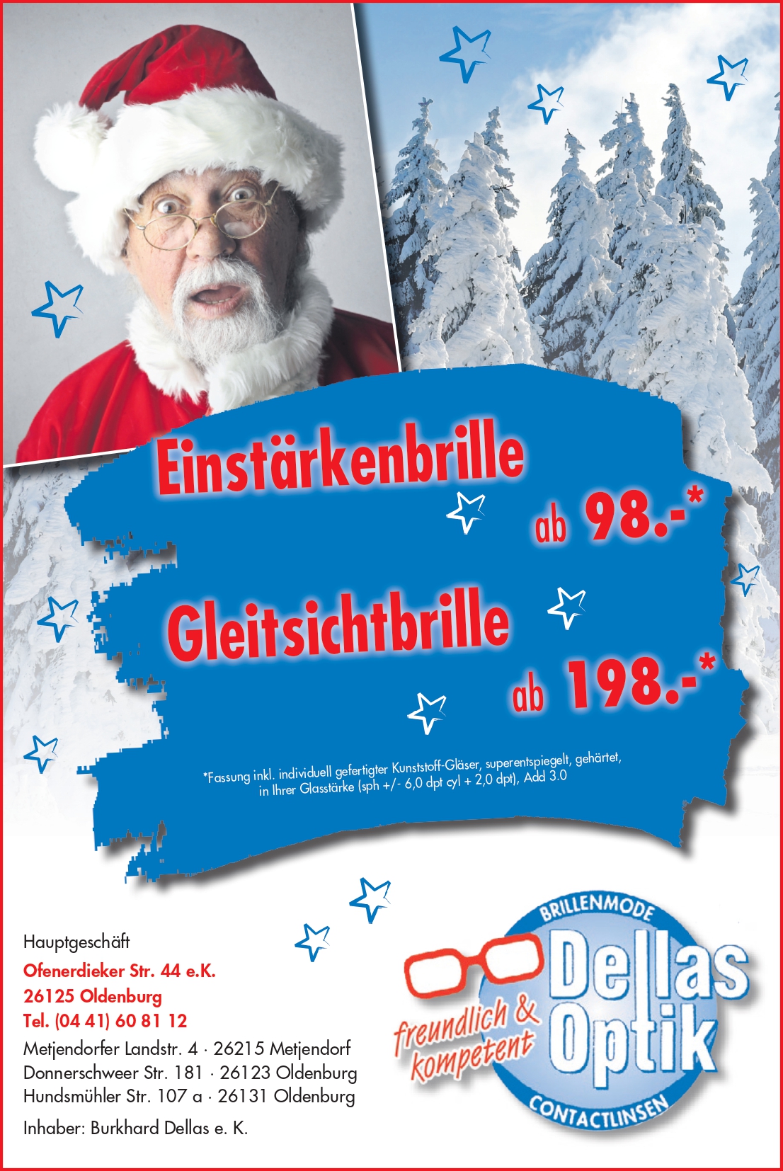 Ob zuhause oder anderswo. Sie wollen die Weihnachtszeit im Kreise Ihrer Lieben genießen und dabei den vollen Durchblick haben? Beim Backen und Kochen die Rezepte lesen, den Kindern oder Enkelkindern Weihnachtsgeschichten vorlesen oder einfach nur sämtliche Weihnachtsfilme im Fernsehen oder im Streaming anschauen können – es braucht die richtige Brille. Die fachlich bestens ausgebildeten Augenoptiker von Dellas Optik legen großen Wert auf eine persönliche Beratung und höchste Präzision bei der Ermittlung Ihrer individuellen Sehbedürfnisse. Denn nur wenn Sie Ihre Augen kennen, erhalten Sie maßgefertigte Brillengläser und Kontaktlinsen, die Ihnen immer den besten Durchblick schenken.
